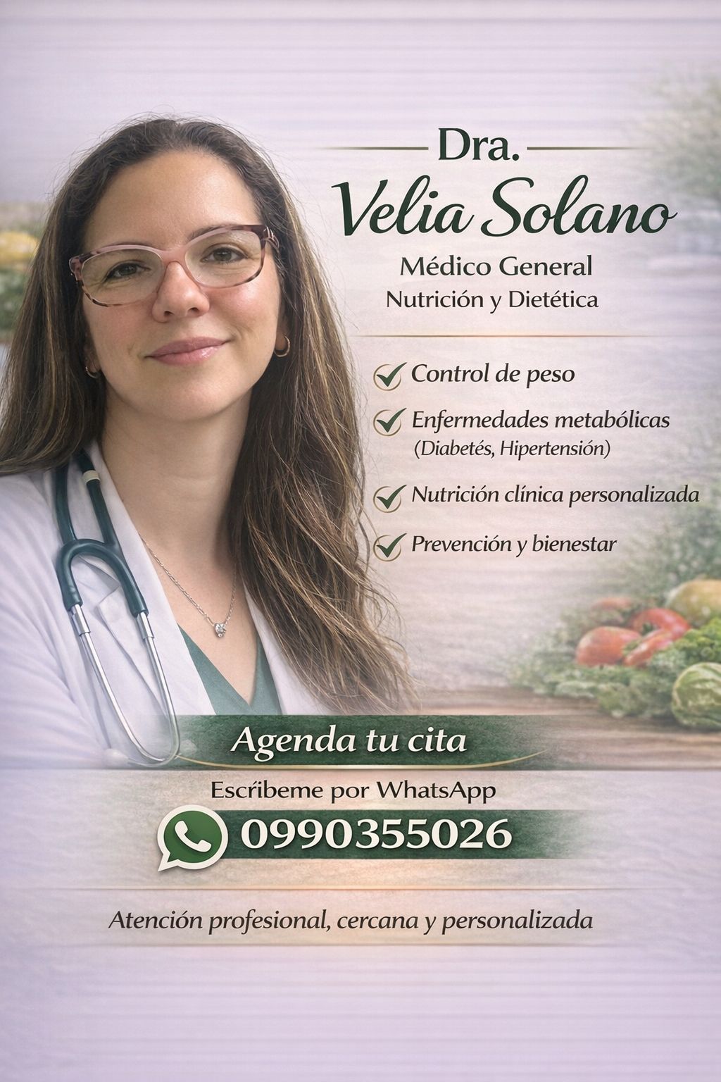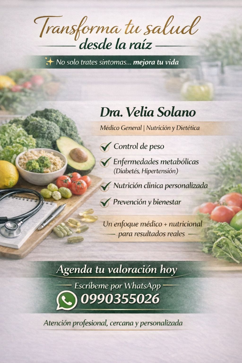 Como Médico General con profundo enfoque en la Nutrición Clínica, sé que la verdadera sanación ocurre cuando dejamos de tratar únicamente los síntomas y abordamos el origen. Mi propósito es ayudarte a transformar tu salud de manera integral, combinando el rigor del diagnóstico médico con planes de asesoría nutricional para que recuperes tu vitalidad.